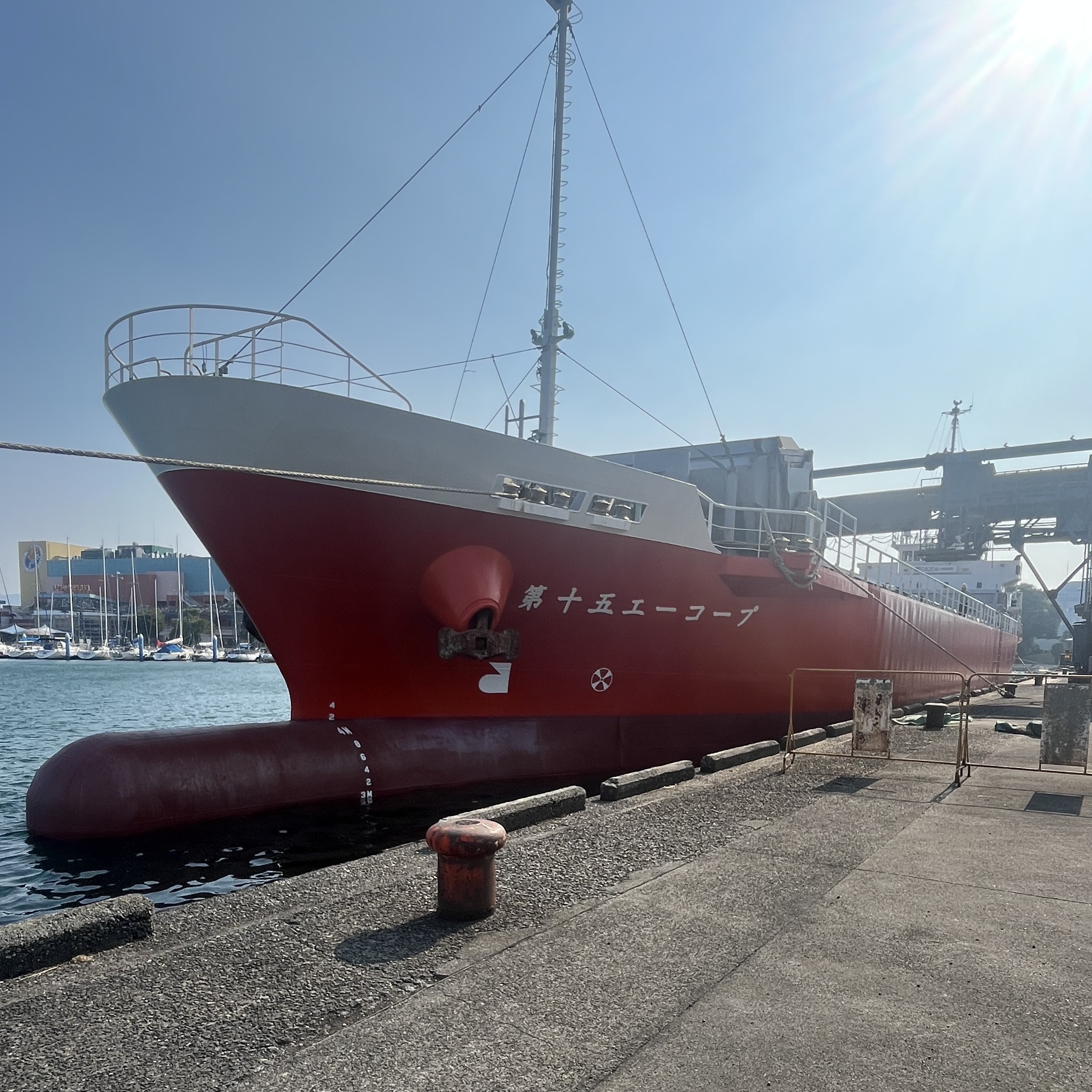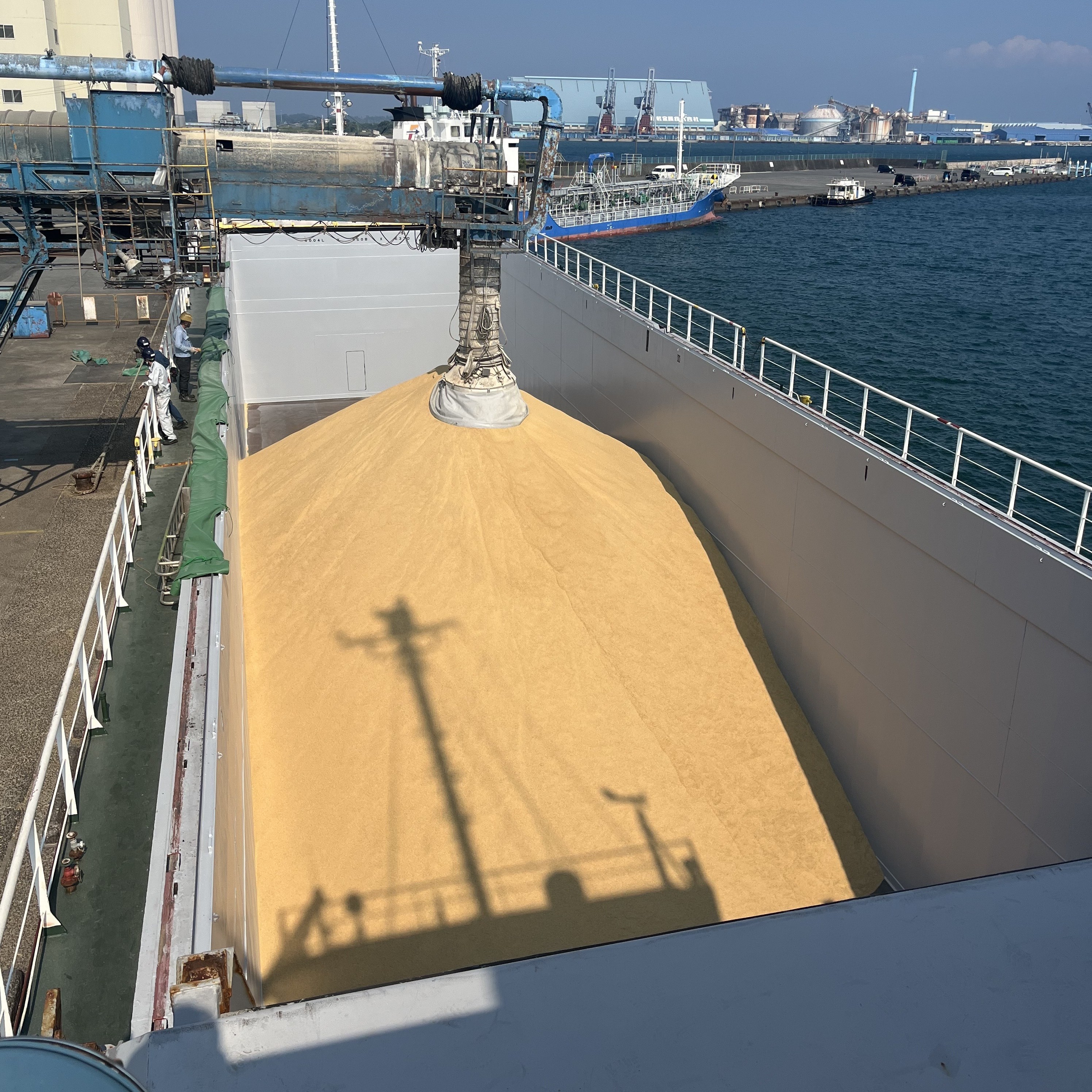 8月4日(月)には、株式会社J-オイルミルズ 静岡工場にて、飼料原料であるロープロ大豆粕800トンを初荷として船積みいたしました。本船の追加により、当社の貨物船は計15隻体制となります。
